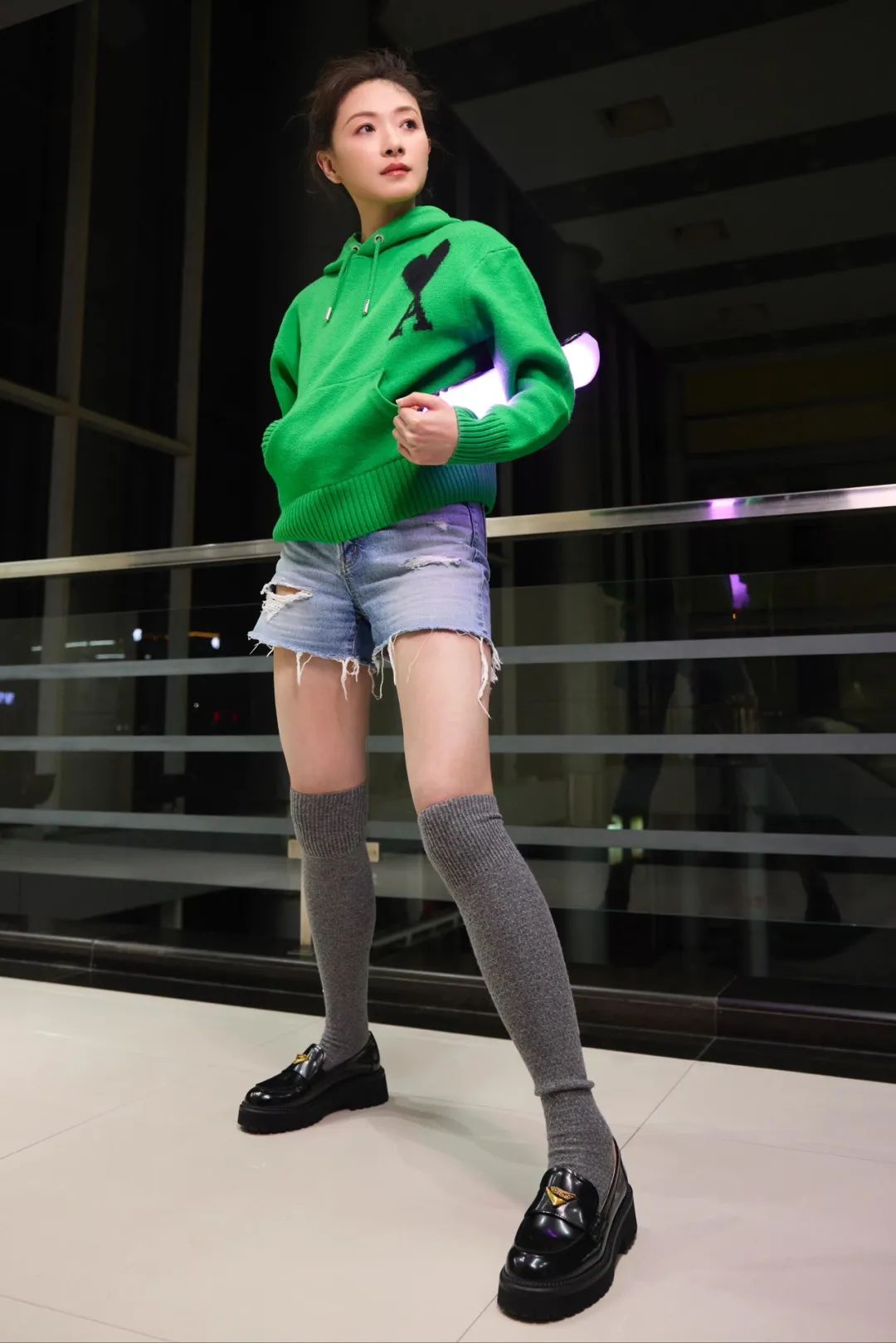 她穿了一件超级抢眼的绿色卫衣,配上破洞牛仔短裤和灰色长袜,鞋子是黑色的厚底皮鞋,这一身搭配,真的是时髦又有点街头感。